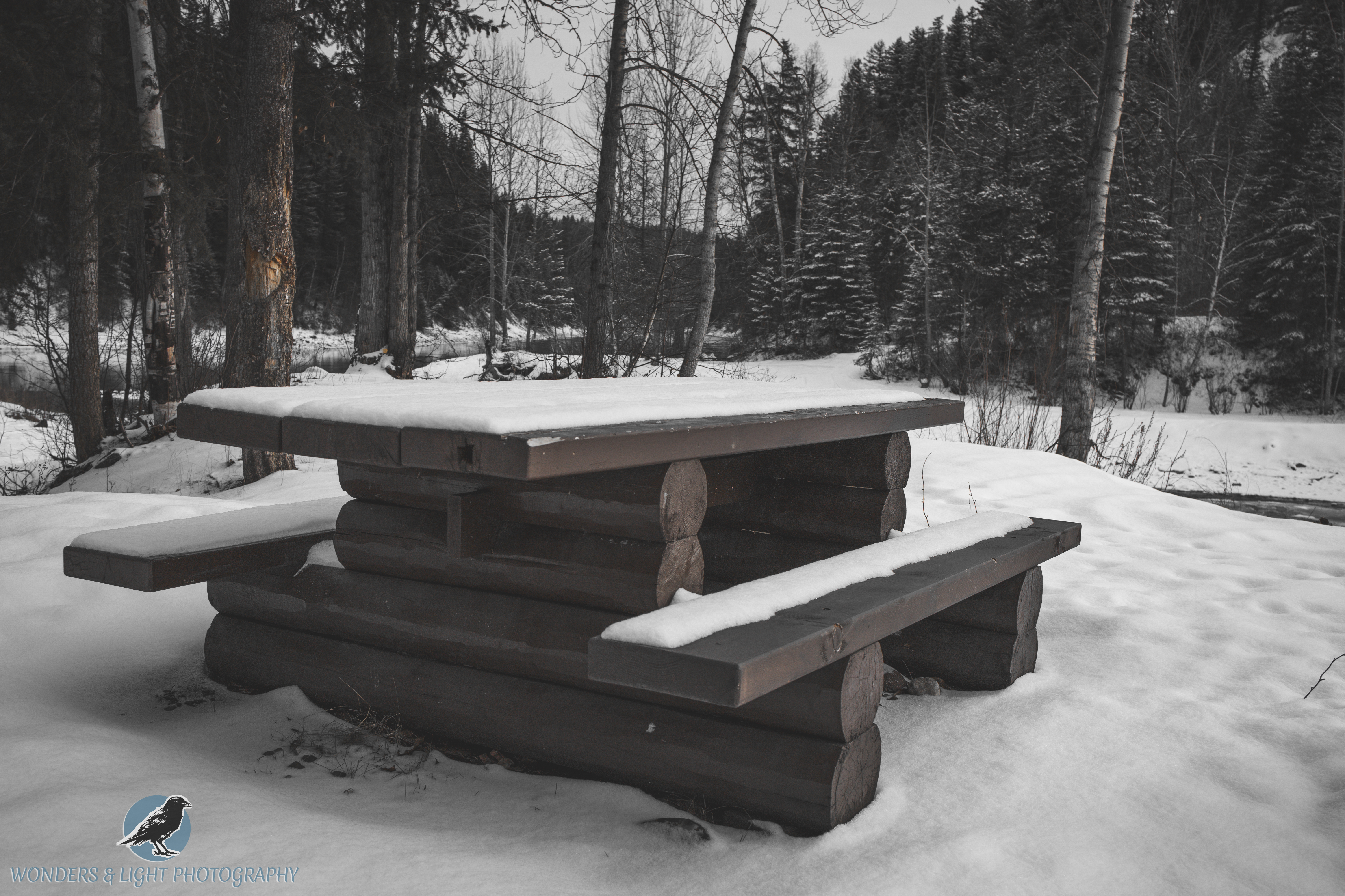 After my appointment today I decided to go for a drive to Beavermouth. No animals on the move today and all was quiet. Only the signs that people were there with a lonely fire pit and a snowy picnic table.